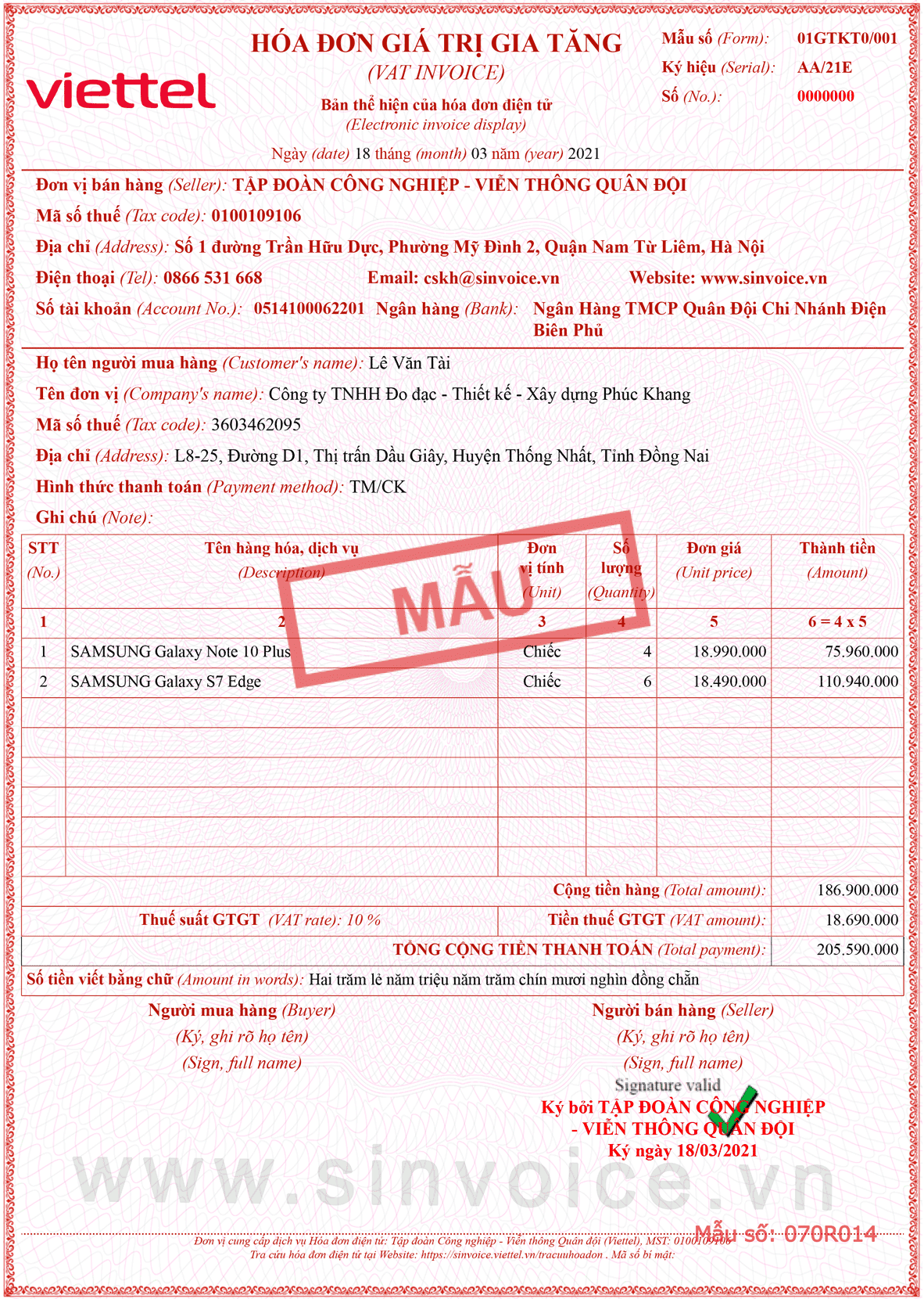 Miễn phí | Khách hàng chọn mẫu hóa đơn điện tử trong danh sách mẫu hóa đơn miễn phí của Viettel đã thiết lập theo đúng quy định. Không hỗ trợ chỉnh sửa, thay đổi trường thông tin. Không thay đổi màu sắc, size chữ. Tham khảo danh sách mẫu miễn phí ngay bên dưới! |